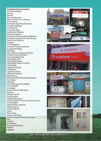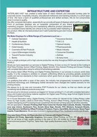 We are specialized in Screen Printing (Half Tone Color) for Human Size Cutouts, Kiosks, Translite (one way vision), Sunboard, Flex, Acrylic Glow Sign, Decals, PVC Stickers, Sunpack Sheets, Foam Banners fortified by Offset Printing of Posters, Flyers, Hand Bills, Brochures, News Paper Inserts, Foam Banners. They are also involved in digital printing of Flex, Sunboards and Acrylic Sheets.